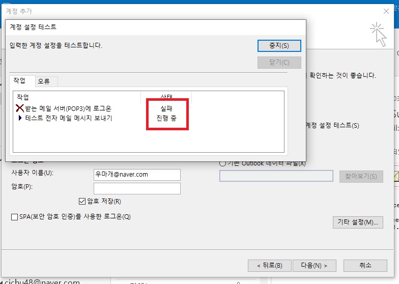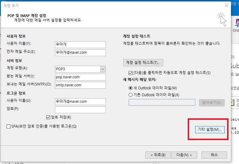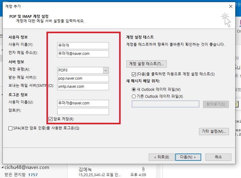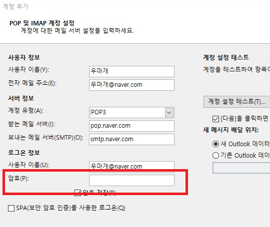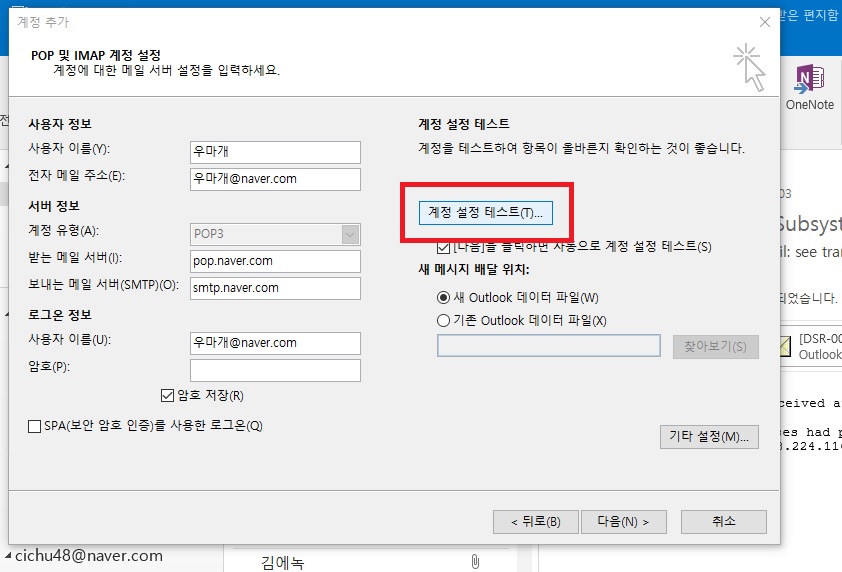 위에 생성된 비밀번호를 위 암호에 입력하고 계정 설정 테스트를 진행하면 아래와같이 네이버 메일이 연동이 되는것을