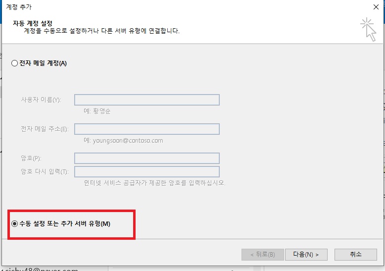 수동 설정 또는 추가 서버 유형 클릭 후 다음 버튼 클릭합니다.
