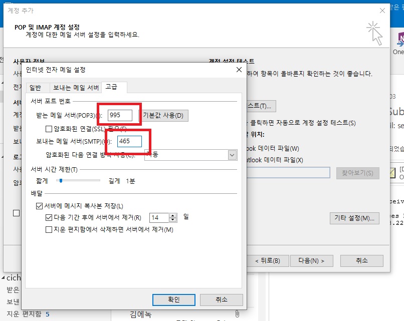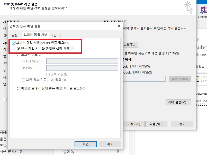 기타 설정 클릭하면 새창이 위와 같이 열리는데 보내는 메일서버 메뉴에서 보내는 메일 서버(SMTP) 인증 필요 에 받는 메일 서버와 동일한 설정 사용 체크 후 확인 버튼 클릭합니다.