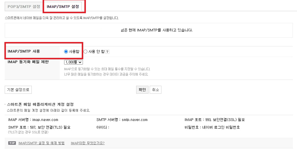 이제 POP3/SMTP 옆에 있는 IMAP/SMTP 설정에 들어가서 위와 같이 IMAP/SMTP 사용에 사용함을 클릭하고 확인을 누릅니다.