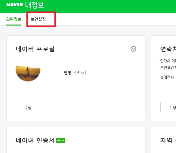 네이버에 내정보 - 보안설정을 클릭하여 들어갑니다.