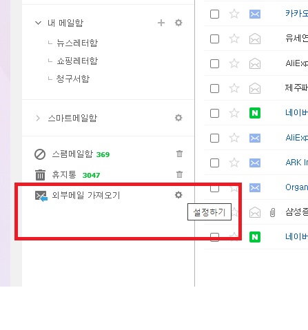 네이버 메일 좌측 하단에 보면 외부메일가져오기 톱니바퀴 버튼을 클릭합니다.