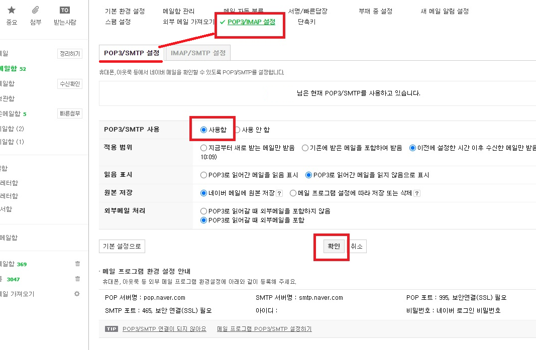 상단 메뉴에 POP3/IMAP 설정을 클릭하면 위와 같은 화면이 나오는데 POP3/SMTP 사용함으로 변경 하고 확인 버튼 클릭합니다.