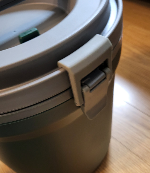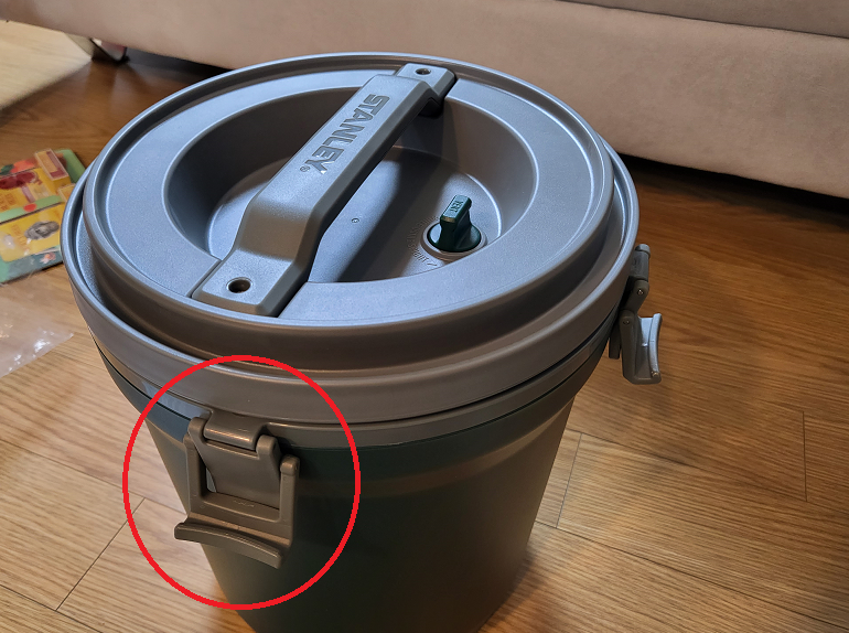 뚜겅은 클립형태로 반찬통 마냥 제끼면 풀리고 걸고 조이면 잠겨지는 스타일입니다.