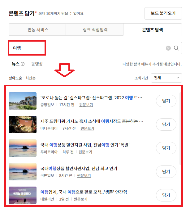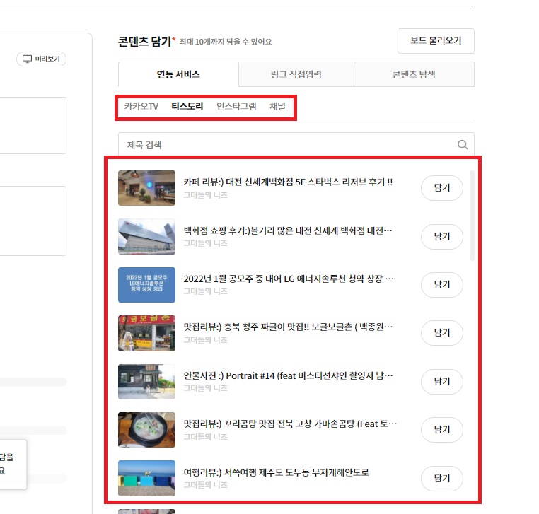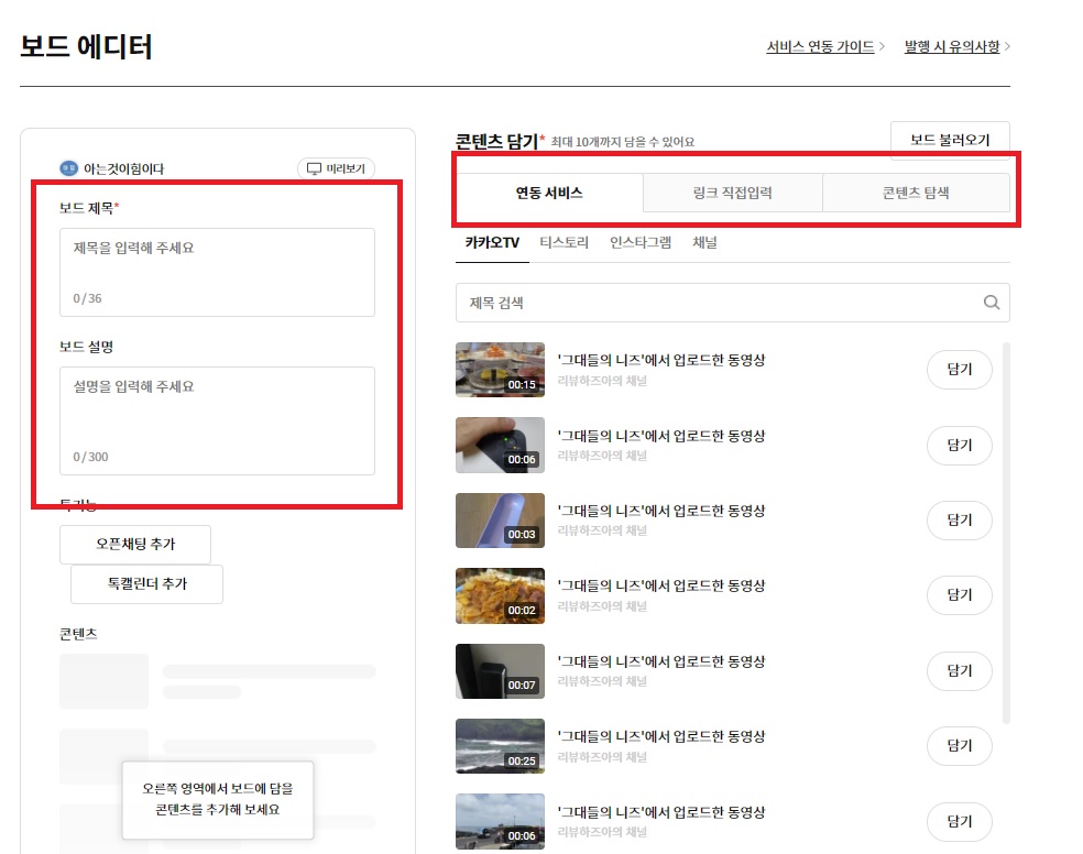 보드 제목은 게시글 제목이라 보시면 되고 , 보드 설명도 간략히 넣어주시면 좋겠죠?? 우측에 보시면 콘텐츠 담기 메뉴가 있는데 연동서비스가 있고 , 링크 직접입력 , 콘텐츠 탐색이 있습니다.