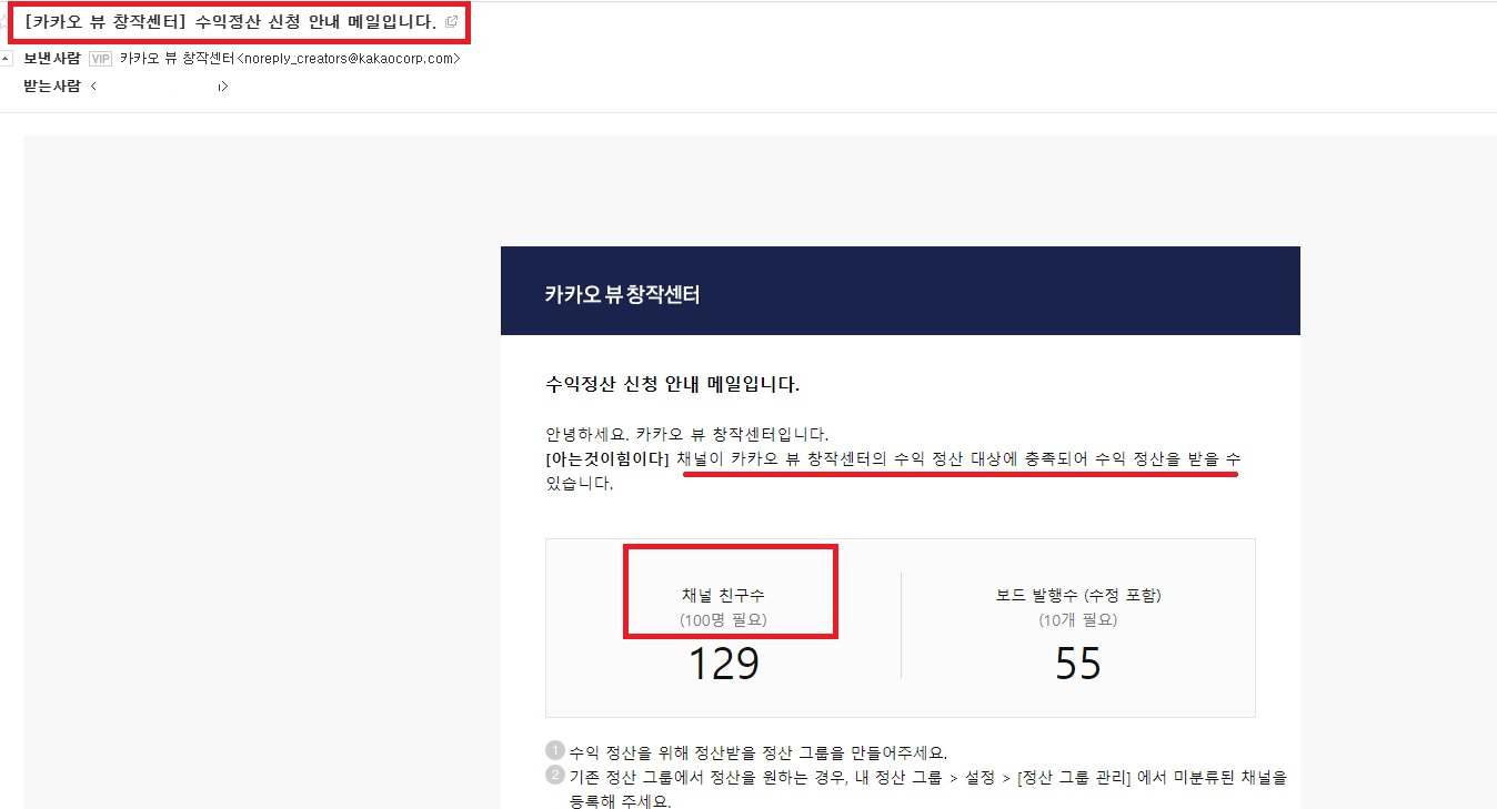 보드발행수 10개와 채널 친구수 100명 조건을 채우면 수익정산 신청을 하라고 안내 메일이 옵니다.