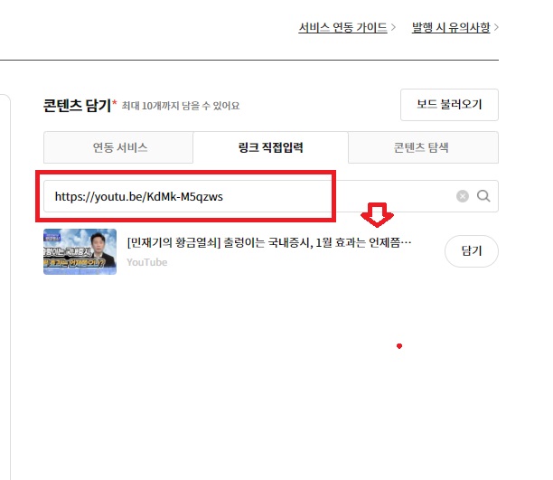이번엔 링크 직접 입력 메뉴인데요 . 다른사람들 콘텐츠의 링크를 복사해서 붙여넣기하여 보드를 개설 할 수 있는 기능입니다. 저는 거의 링크 직접입력 메뉴를 많이 이용해서 보드를 개설하고있습니다.^^