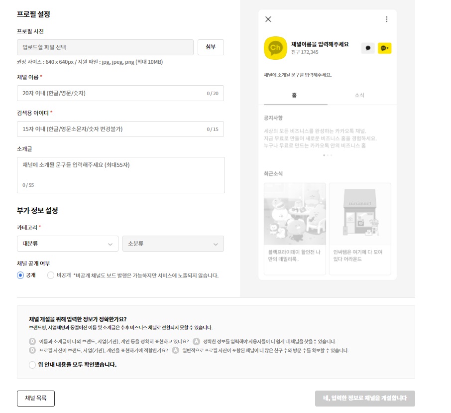 여기서 채널이름을 설정해줍니다. 다른사람들이 봤을때 내 카카오뷰 채널이름을 보게 되는거니 간판이름이라고 보시면 됩니다. 검색용아이디는 내 카카오뷰 주제에 맞는 카테고리로 잡아서 검색해서 유입될 수있는 키워드로 잡아주시면 됩니다. 나머지 소개와 카카오뷰 카테고리를 분류 하고 하단에 채널을 개설합니다. 버튼을 누르면 채널이 개설이 됩니다.^^