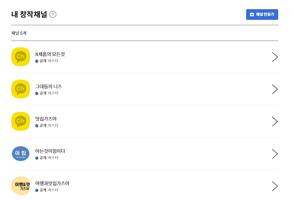 로그인을 하게 되면 내 창작채널 항목이 아래와 같이 나오는데 전 이미 5개를 개설해놔서 5개로 나오는거고, 처음 만드시는 분들은 아무것도 없을겁니다. 채널만들기를 클릭합니다.