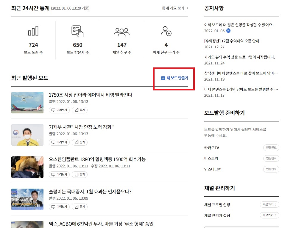 채널을 개설했으면 보드를 만들어 새로운 사람들이 유입되게 해야 합니다.^^