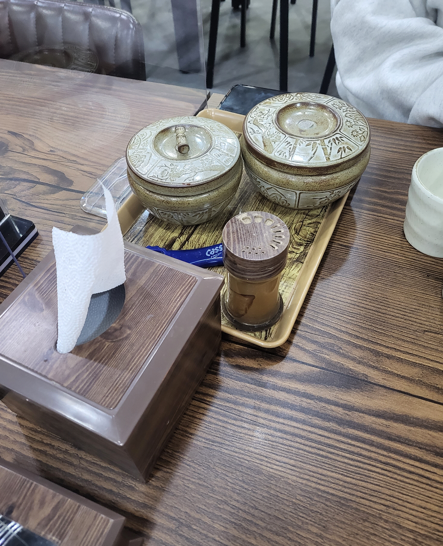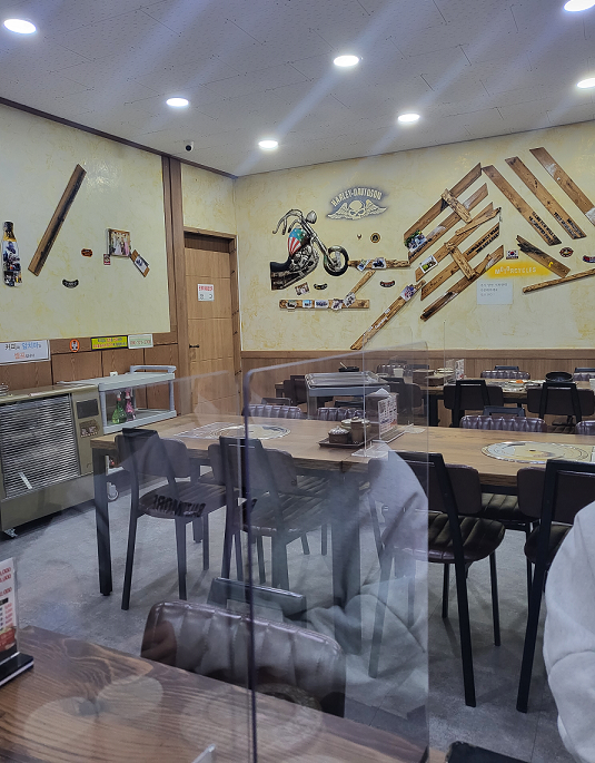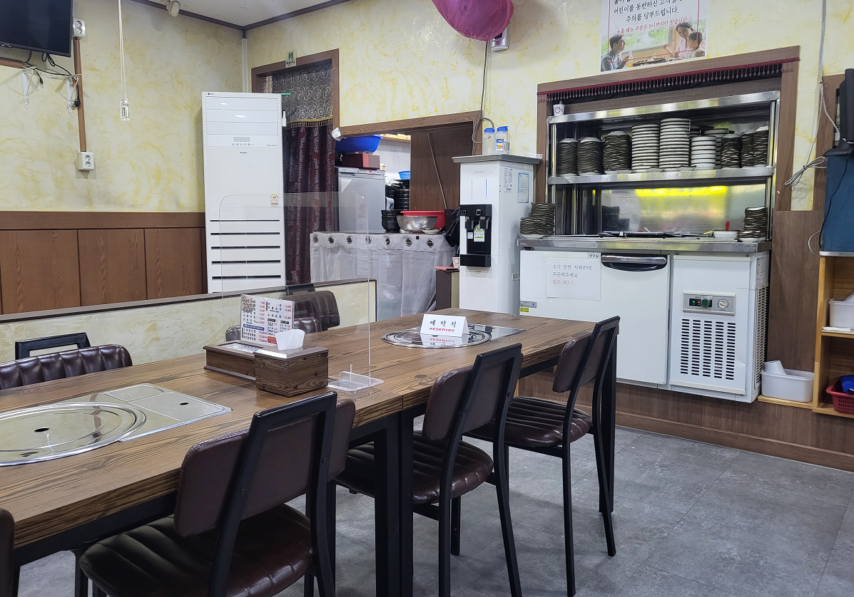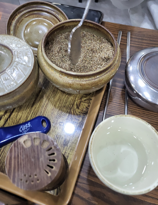 코로나 시대에 걸맞게 테이블마다 코로나 방어벽이 쳐져있네요 ㅎㅎㅎ 테이블에 들깨가루 , 후추가루 , 소금 준비되어있습니다.
