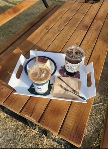 바닐라라떼와 아이스아메리카노랑 케익을 시켰습니다. 실내에는 강아지 출입이 안되어 외부 야외 테이블로 이동했습니다. ㅎㅎ