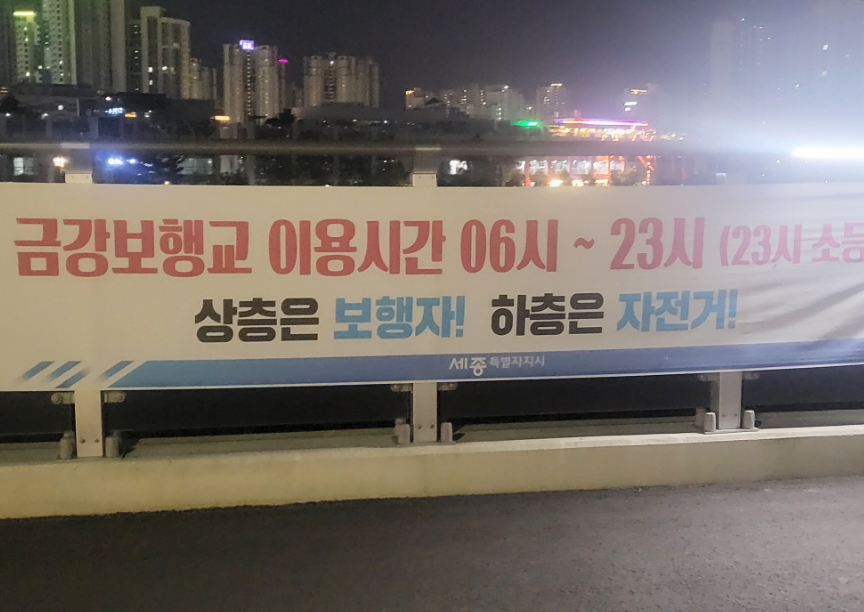 세종 금강보행교 이응다리의 보행로를 잘보면 좌측 노면 , 우측 인도로 구분되어있습니다. 인도는 그냥 걷는 사람들용 , 좌측 노면은 운동하는 사람들 용으로 보시면 될 거 같네요 ^^. 세종시는 이런 부분을 아주 세심하게 잘 만들어 놨어요