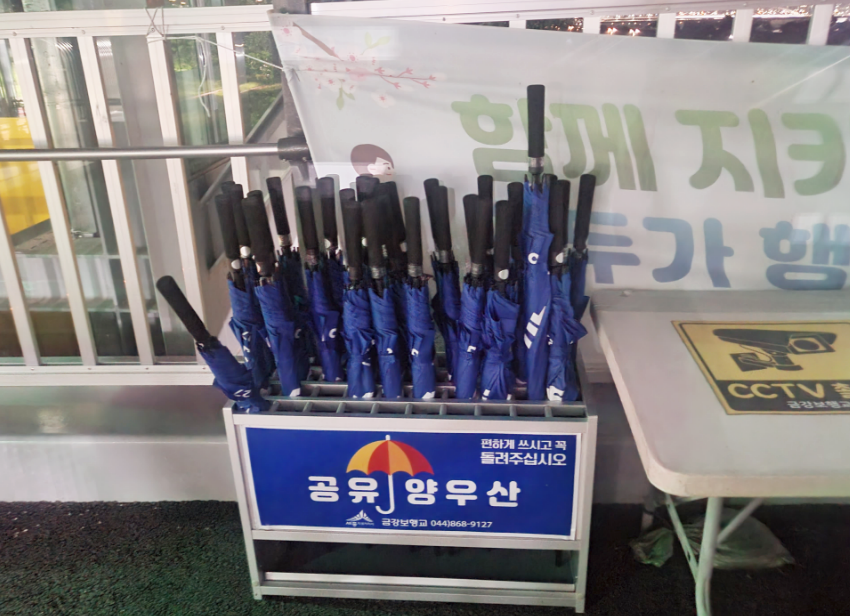 낮에는 더우니까 세종 금강보행교 입구에 양우산도 무상 제공을 해주네요 ^^. 낮에 오시는분들은 참고하시어 양산이 없으면 여기서 가져갔다가 반납하시면 됩니다.