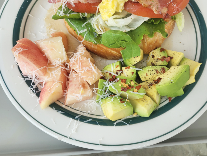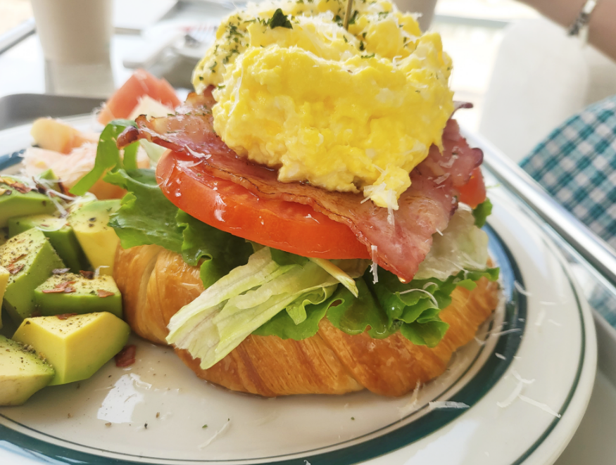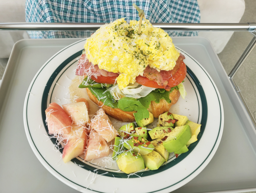 로프패스츄리, 스크램블에그, 그릴드베이컨, 양상추, 루꼴라,로메인,토마토 , 캘리포니아소스, 메이플시럽, 그라나파다노치즈, 아보카도 half ,계절과일이 들어가있는 메뉴이며 , 저희는 이거 먹으려고 브런치타임에 맞춰 방문했어요 ㅎㅎㅎ