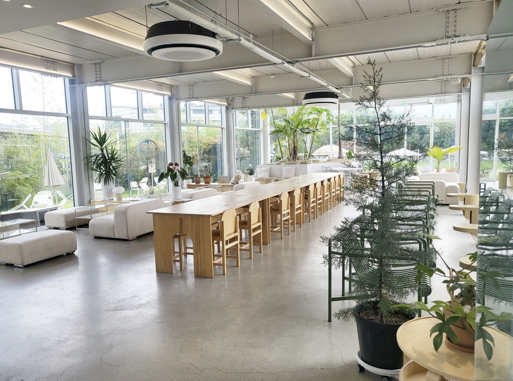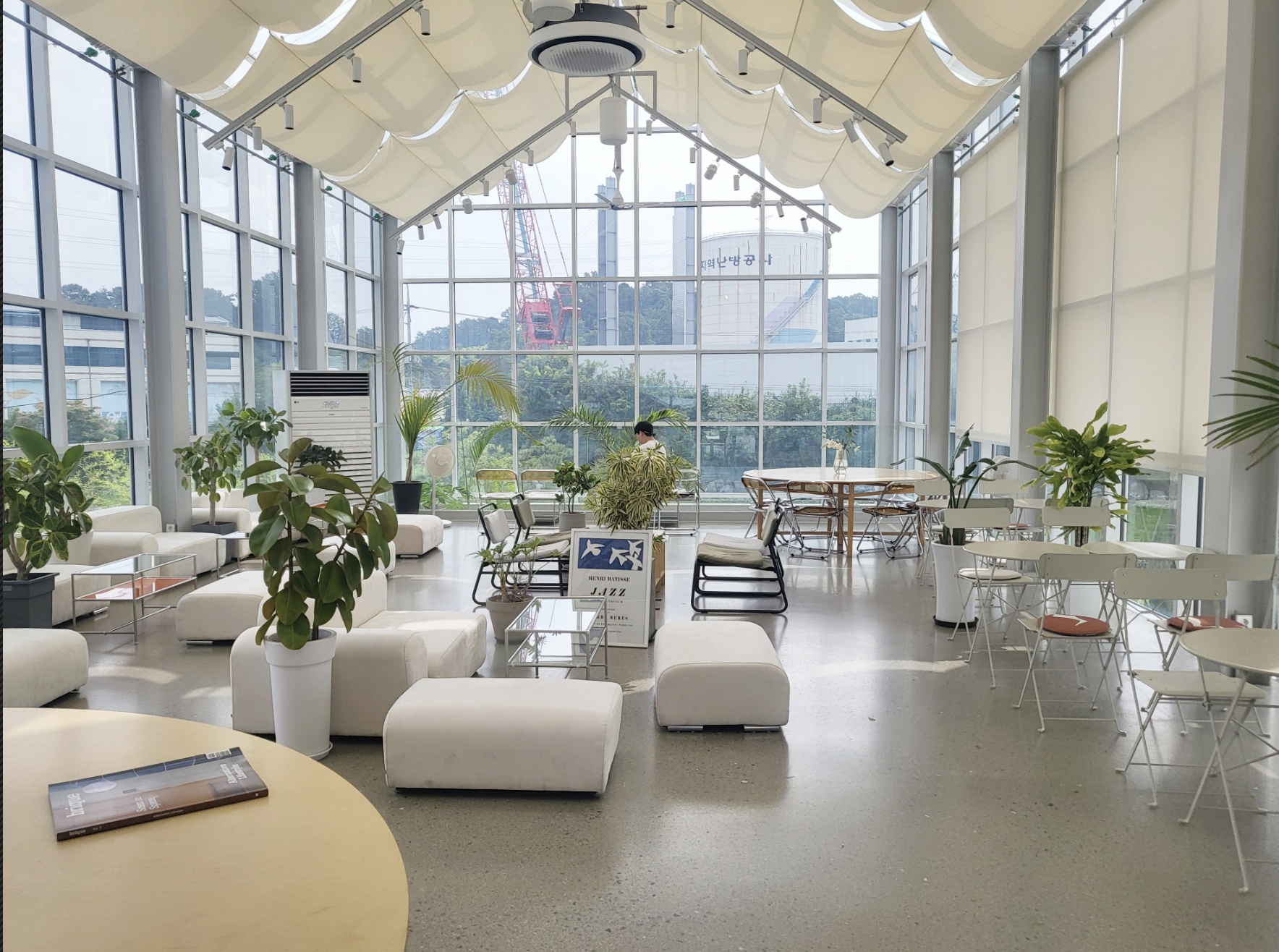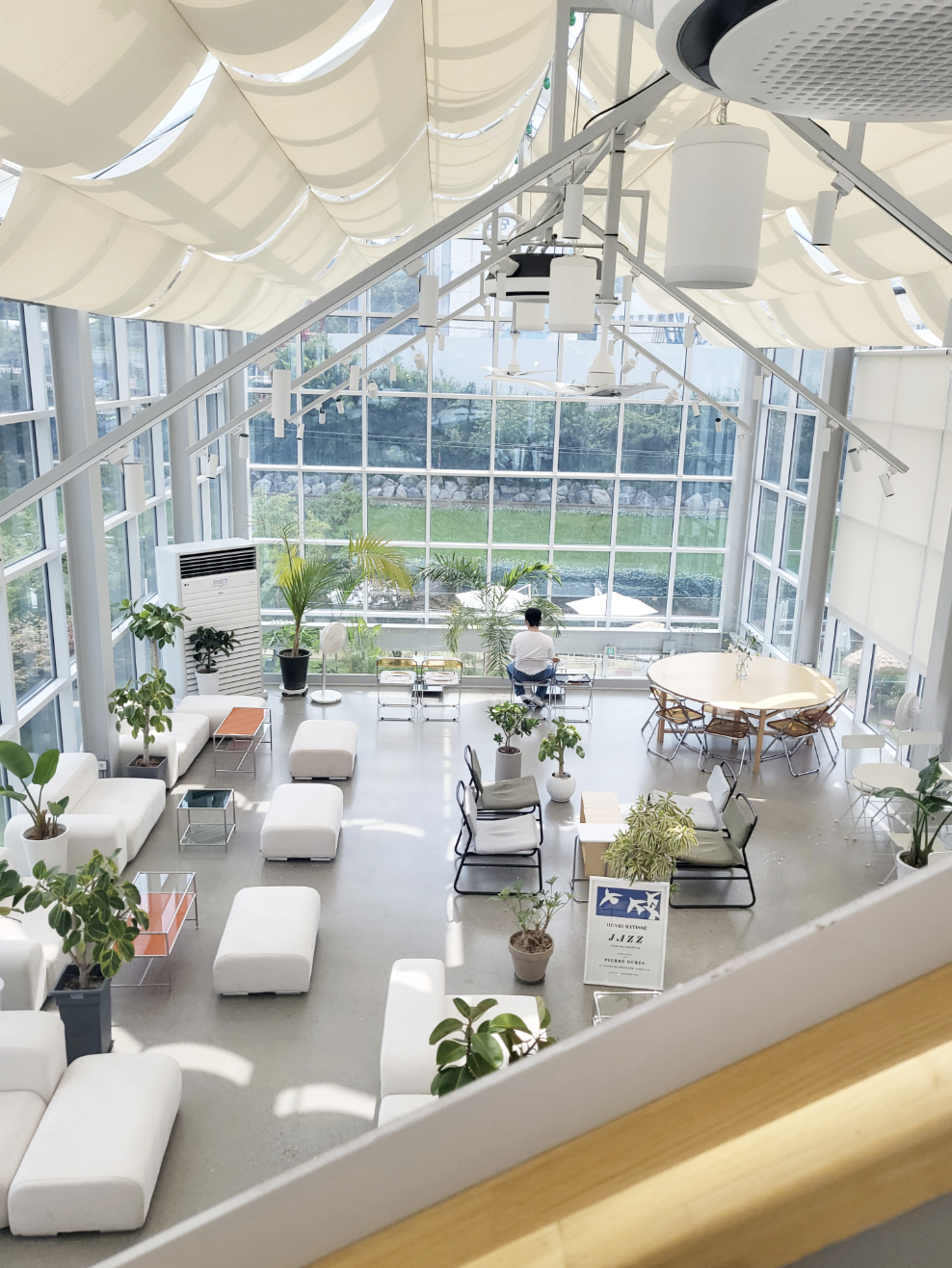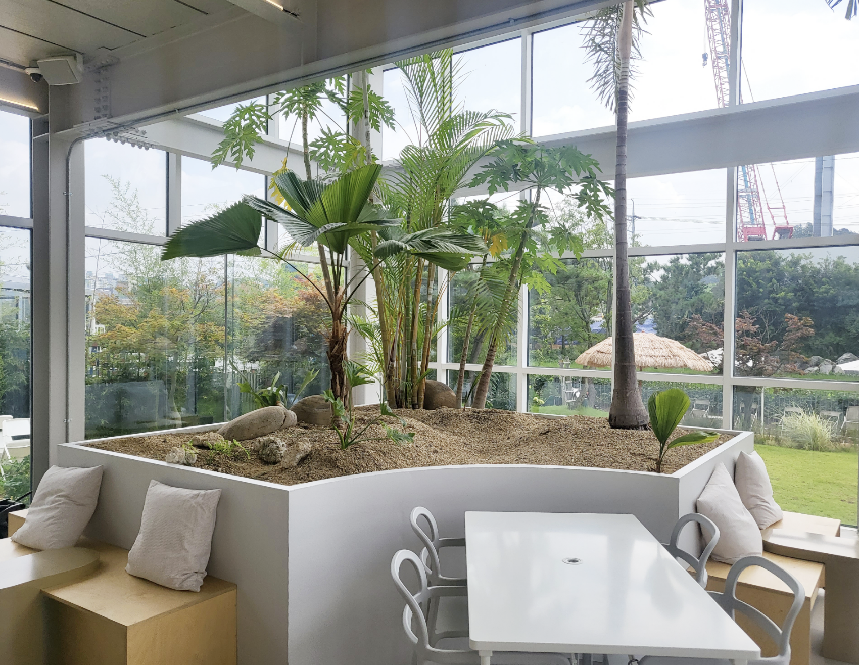 카페 컨셉은 전체적인 느낌은 실내 온실식물원 느낌이며 , 썬룸 라운지, 오아시스, 정원등 다양한 공간으로 구성되어있습니다.