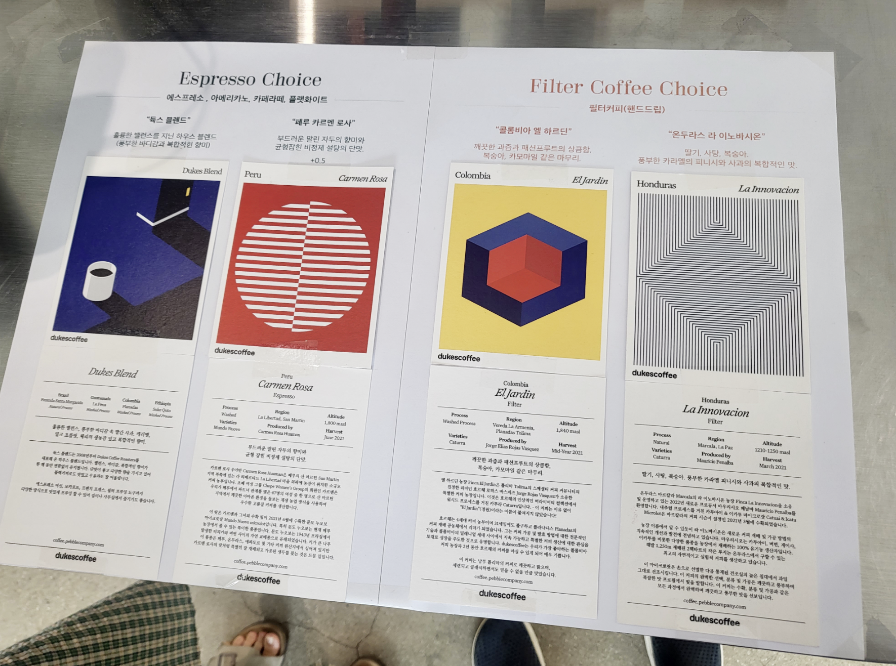 내부 구경은 다했고 이제 저희도 커피와 샌드위치를 시켜보러 다시 1층으로 내려왔습니다. 주문은 1층 건물 출입구 들어오면 바로 보입니다. 위 사진과 같이 커피 주문시 원두도 고를수 있어서 취향대로 고르시면 되시겠습니다.