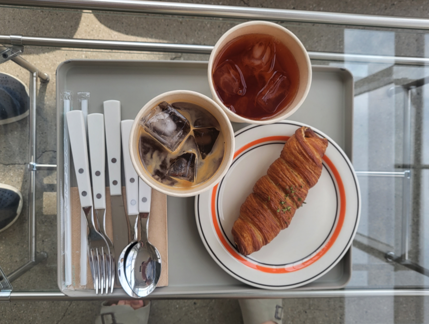 저희가 주문한 아이스 아메리카노, 아이스티와 베이컨 , 그리고 샌드위치가 나왔어요 ~ !! 오늘의 메인 메뉴는 샌드위치입니다. ㅎㅎ