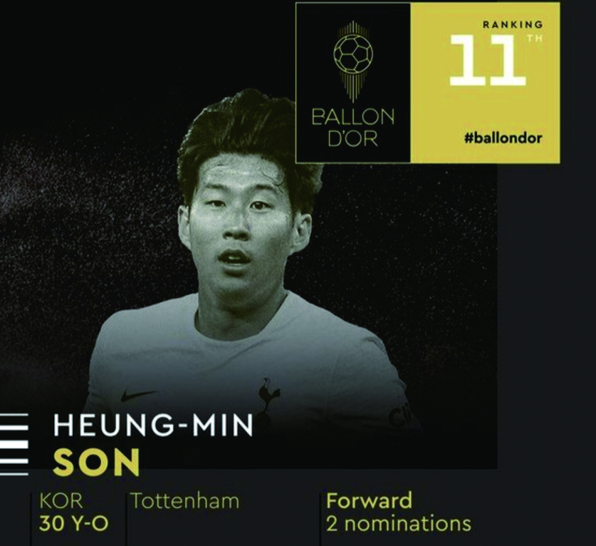 손흥민은 10월 18일에 열린 2022 발롱도르 시상식에서 후보 30명 중 아시아 최초 영광의 11위에 올랐습니다.