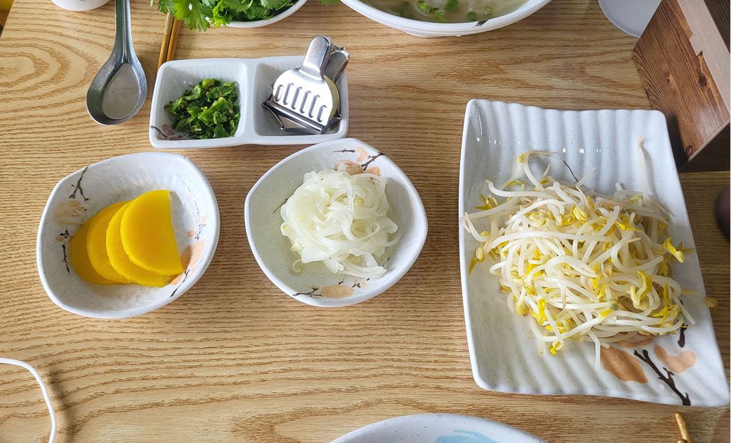 기본 밑반찬은 아주 심플하게 나와요 ~!! 새콤한 양파와 , 단무지 , 베트남쌀국수에 넣어서 먹을 토핑(콩나물 ) 이 나와요