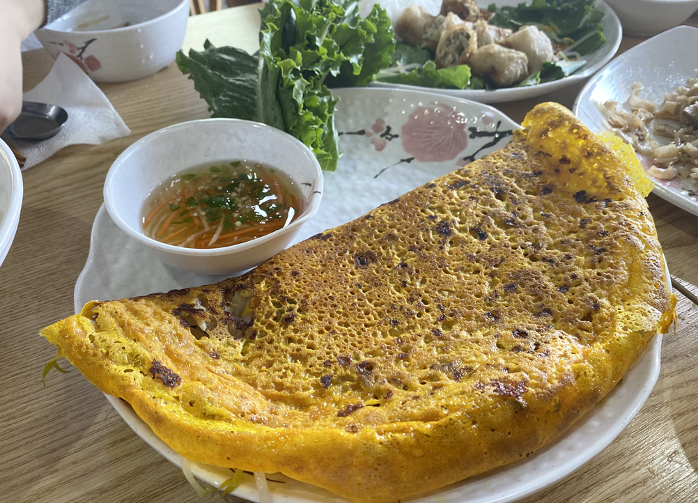 애는 반쎄오라는 음식인데요 !!! 쌀가루 반죽을 프라이팬에 얇게 부쳐서 여러가지 채소와 해물등을 넣고 반으로 접어 먹는 음식입니다 ㅎㅎㅎ 애도 마찬가지로 소스랑 찍어서 상추에 싸 묵으면 맛이 기똥찹니다