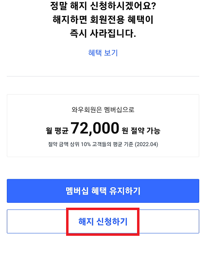 6. 또 정말로 해지 할 것인지 지겹게 물어봅니다. 내가 받고 있는 혜택 포기하기를 클릭합니다. 그러면 또 와우 전용 쿠폰이 사라진다고 하며 , 해지 할것인지 지겹게 또 물어봅니다. 멤버십 해지 신청하기를 클릭합니다.