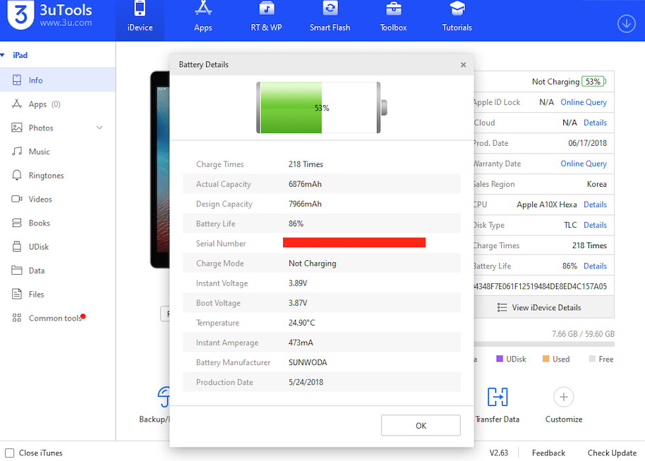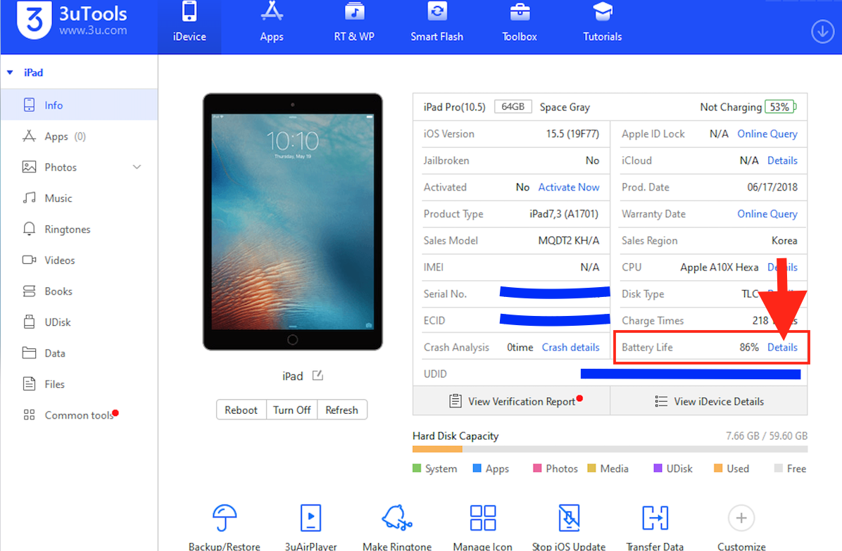 6. 아이패드와 컴퓨터간의 연결이 정상적으로되면 아이패드의 여러가지 정보와 배터리 성능을 확인 할 수 있습니다. 저희는 배터리 성능을 확인하려 설치 진행을 했기때문에 우측 하단에 빨간색 테두리를 보시면 Battery life 에 배터리 %가 표시되는 것을 확인 할 수 있습니다.