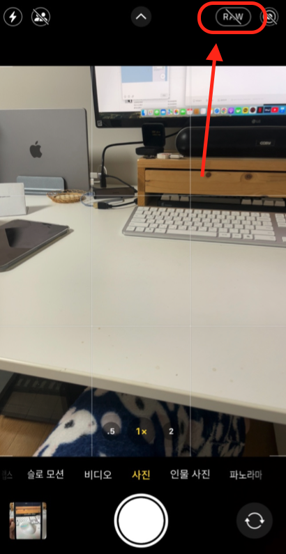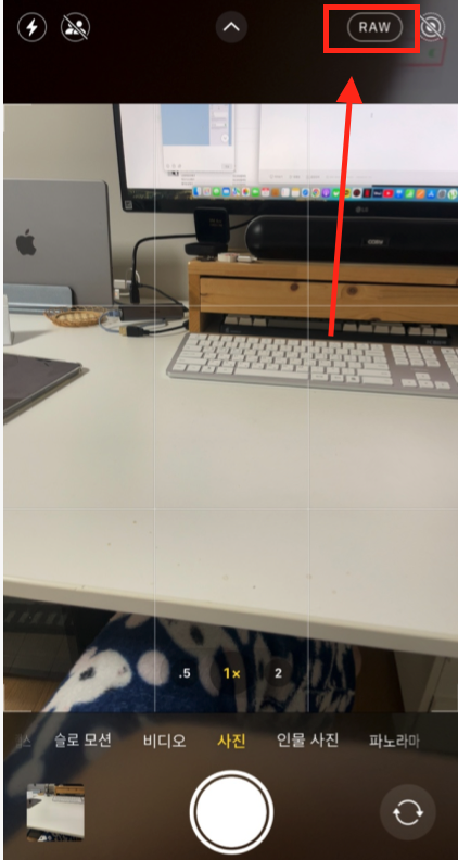 애플 RAW 파일로 사진 촬영을 하고 싶을때는 우측 상단에 있는 RAW 아이콘을 누르면 대각선으로 그어져있던 대각선이 사라지고 RAW 설정 기능이 활성화되어 RAW 파일로 촬영 할 수 있게 됩니다. 적절하게 RAW ON , OFF 를 사용하여 환경에 맞게 사진 촬영하시면