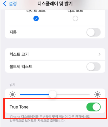 저희는 생각보다 다양한 환경에서 사진을 촬영하고 보정합니다. 그날그날의 날씨와 조명의 색갈이 다르기 때문에 이 트루톤 기능은 아이폰이 그러한 상황을 자동으로 인식하고 실제에 가까운 색과 밝기를 보여주도록 화면 설정을 해주는 기능입니다. 수시로 바뀌는 조명 환경은 True Tone 기능으로 해결 할 수 있습니다. 하여 이기능을 꼭 ON으로 바꾸시는걸 추천드립니다.