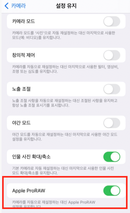 2. 설정 - 카메라 - 설정유지 - Apple ProRAW 기능 ON 시키시면 됩니다.