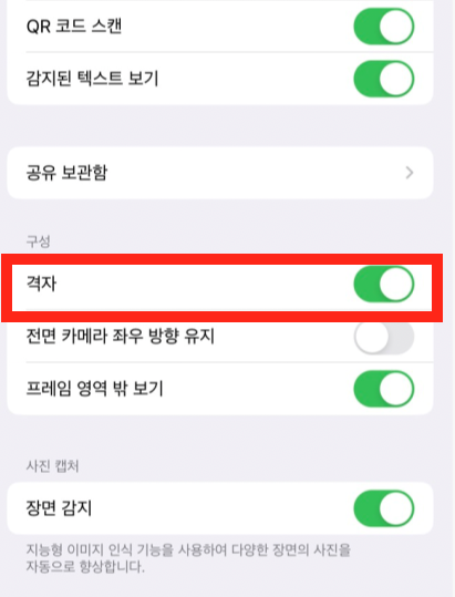아이폰에서 설정 - >카메라 -> 격자 ON 으로 설정하시면 간단하게 격자 설정이 활성화 됩니다.