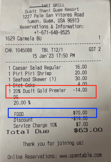 음식값이 총 70달러인데 , 20% 할인되어 14달러가 차감된게 확인이 가능하죠^^