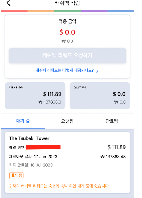 캐쉬백 리워드 상태가 대기중으로 확인을 할 수 있습니다.