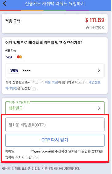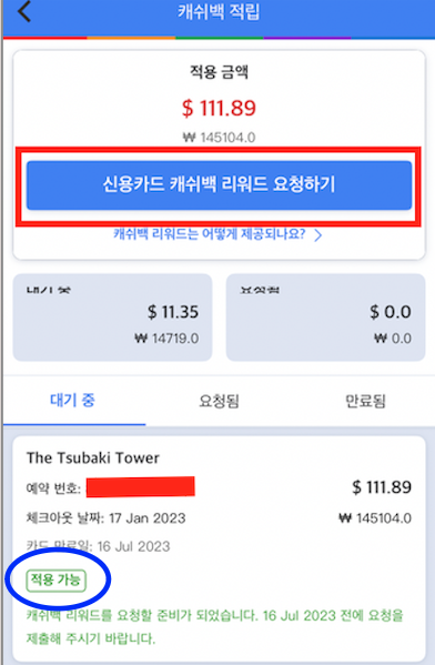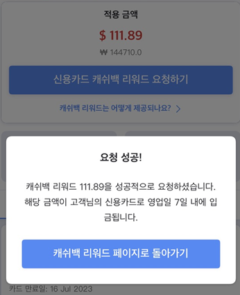 적용금액이 아래와 같이 111.89달러가 표시되며 , 신용카드 캐쉬백 리워드 요청하기 버튼이 활성화가 됩니다.