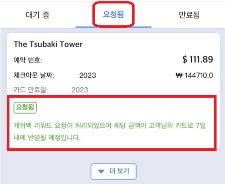 캐쉬백 리워드 요청 상태가 대기중에서 요청됨으로 변경되었음을 확인 할 수 있습니다.