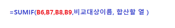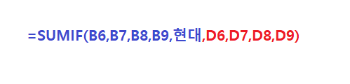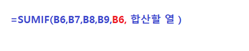=SUMIF(B6,B7,B8,B9 로 입력하면 됩니다.