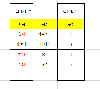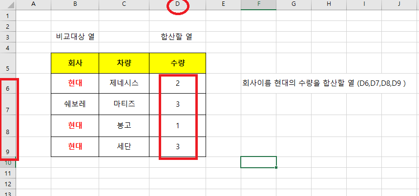 3) 비교대상의 수량을 합산할 열 ( D6,D7,D8,D9 )