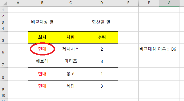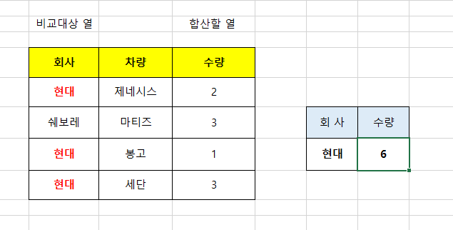 현대 회사의 수량을 합산한 값이 6으로 표시되는 것을 확인 할 수 있습니다.