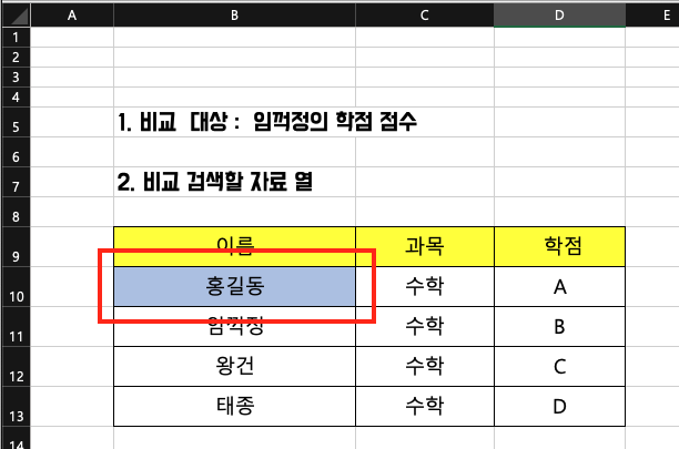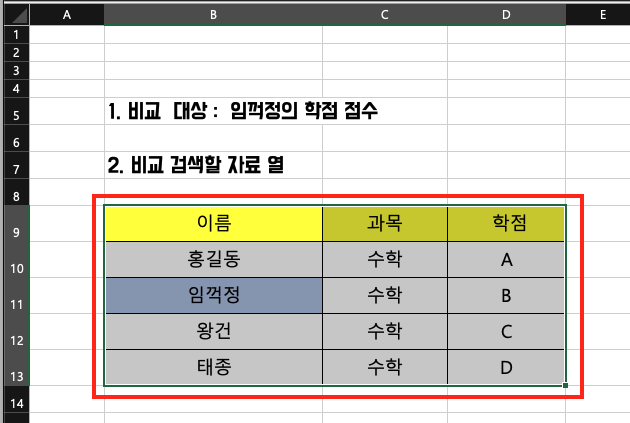 검색할 값 (컬럼)은 B11에 위치한 임꺽정이 됩니다.