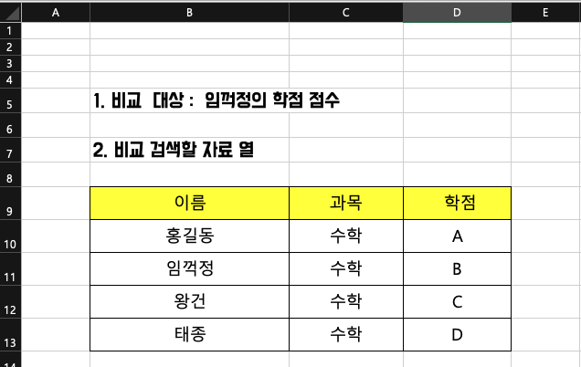 예제 ) VLOOKUP 함수를 이용하여 아래 표에서 이름이 임꺽정인 학생의 수학 과목의 학점은 무엇일까??