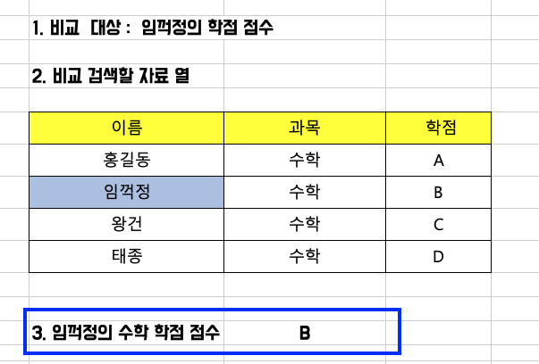 저희는 임꺽정 ( 검색값 ) 의 찾고자 하는 다른 값 ( 학점 )을 표시해야하니까