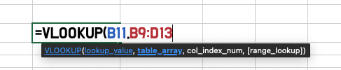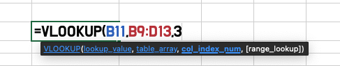 =VLOOKUP(B11,B9:D13,3,FALSE)