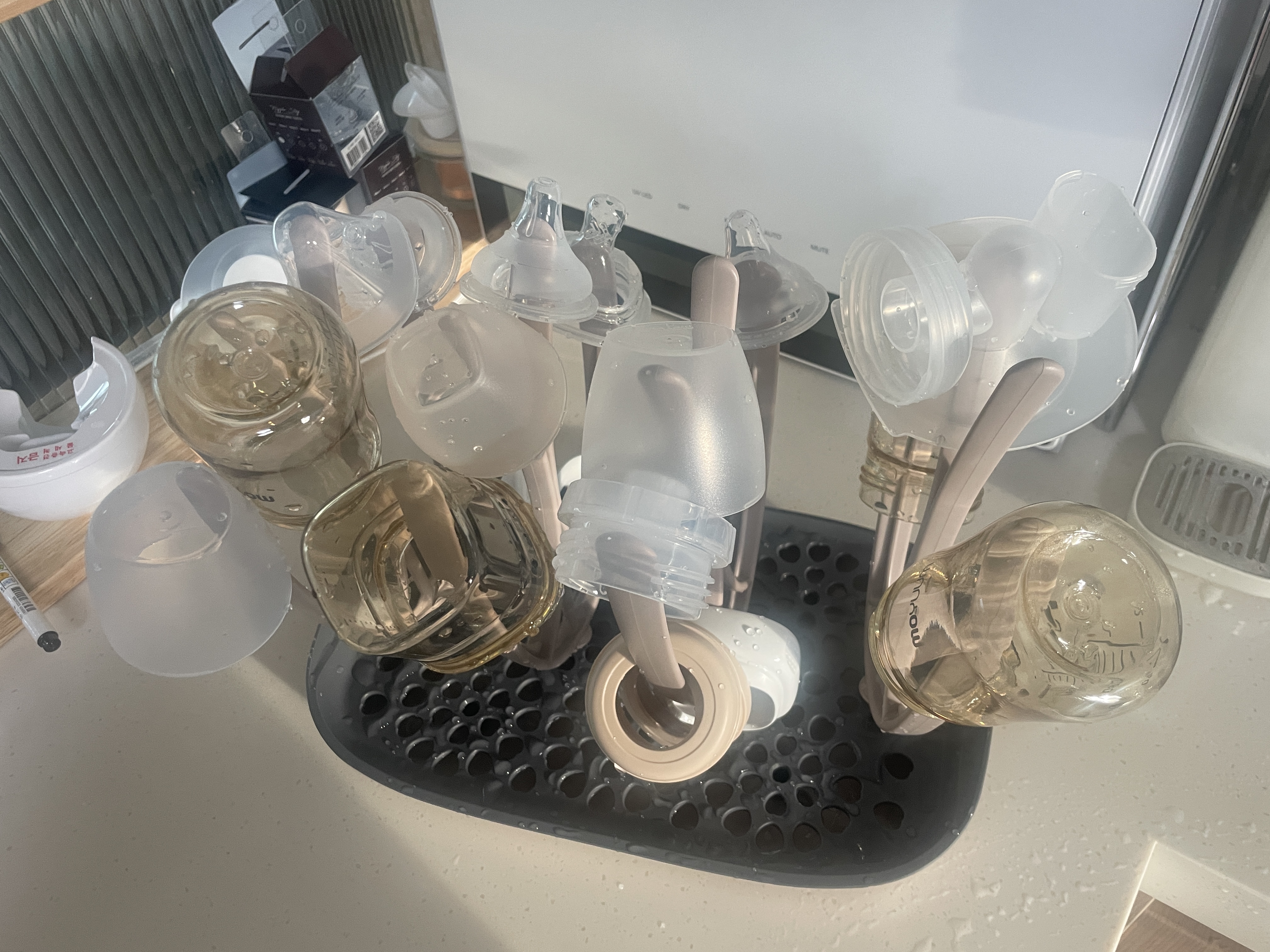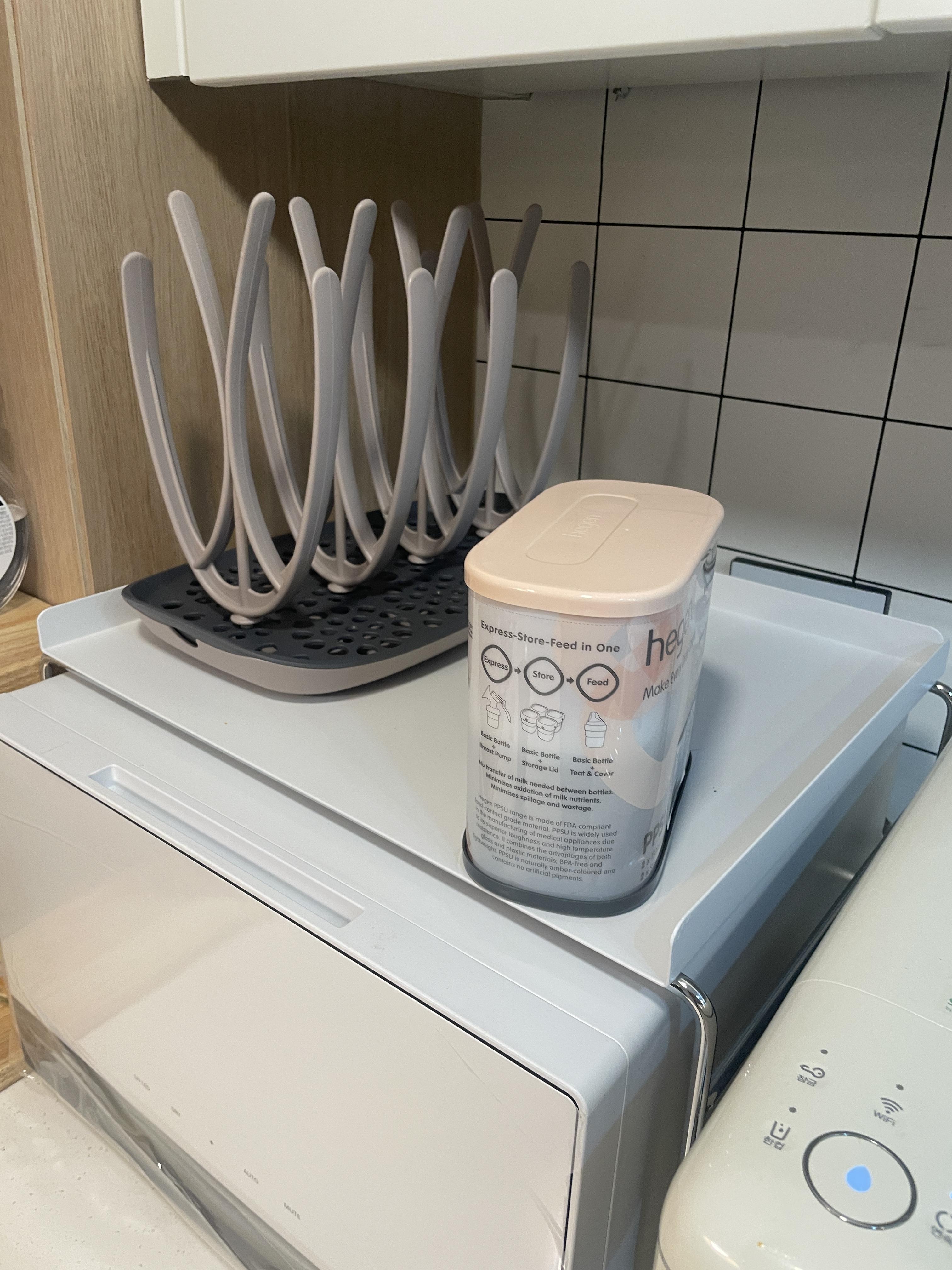 저희는 젖병 소독기 위에 젖병 건조대를 위치해놓고 , 젖병을 세척한 후에 건조대에 물기를 어느정도 뺴고나서