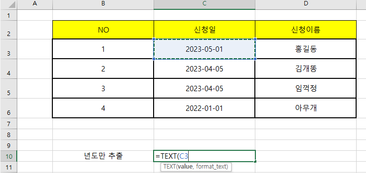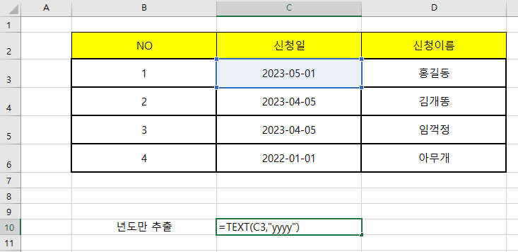저는 표 C3에 있는 신청일 날자의 년도만 추출해보겠습니다.