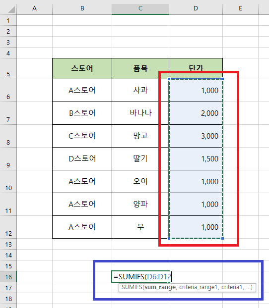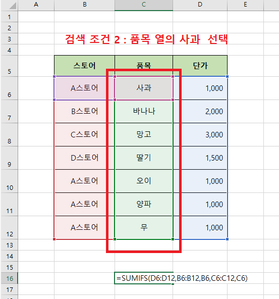 예제에서는 A스토어의 사과 판매 단가의 총합을 구하려고하는거니까