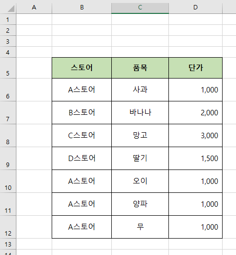 스토어 열의 범위에서 A스토어만 추출하기위해