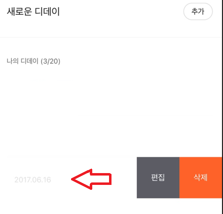 등록된 D-DAY 목록에서 손가락으로 좌측으로 드래그하면 편집 및 삭제 버튼이 있습니다.