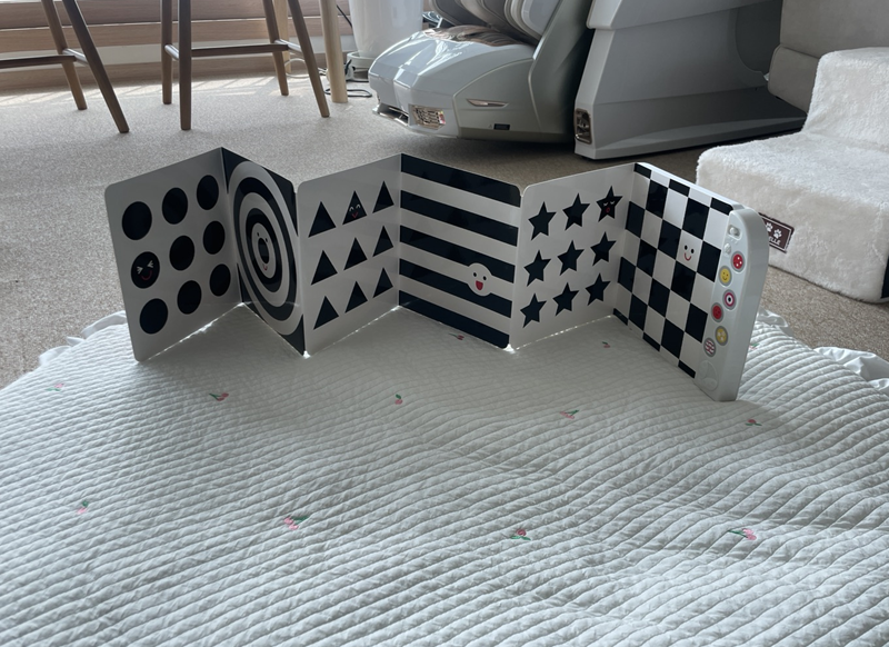 보통 방수매트위에나 , 역류방지쿠션 주변에 이렇게 펼쳐놓고 아기를 눕혀서 초점을 보게 유도합니다. ^^