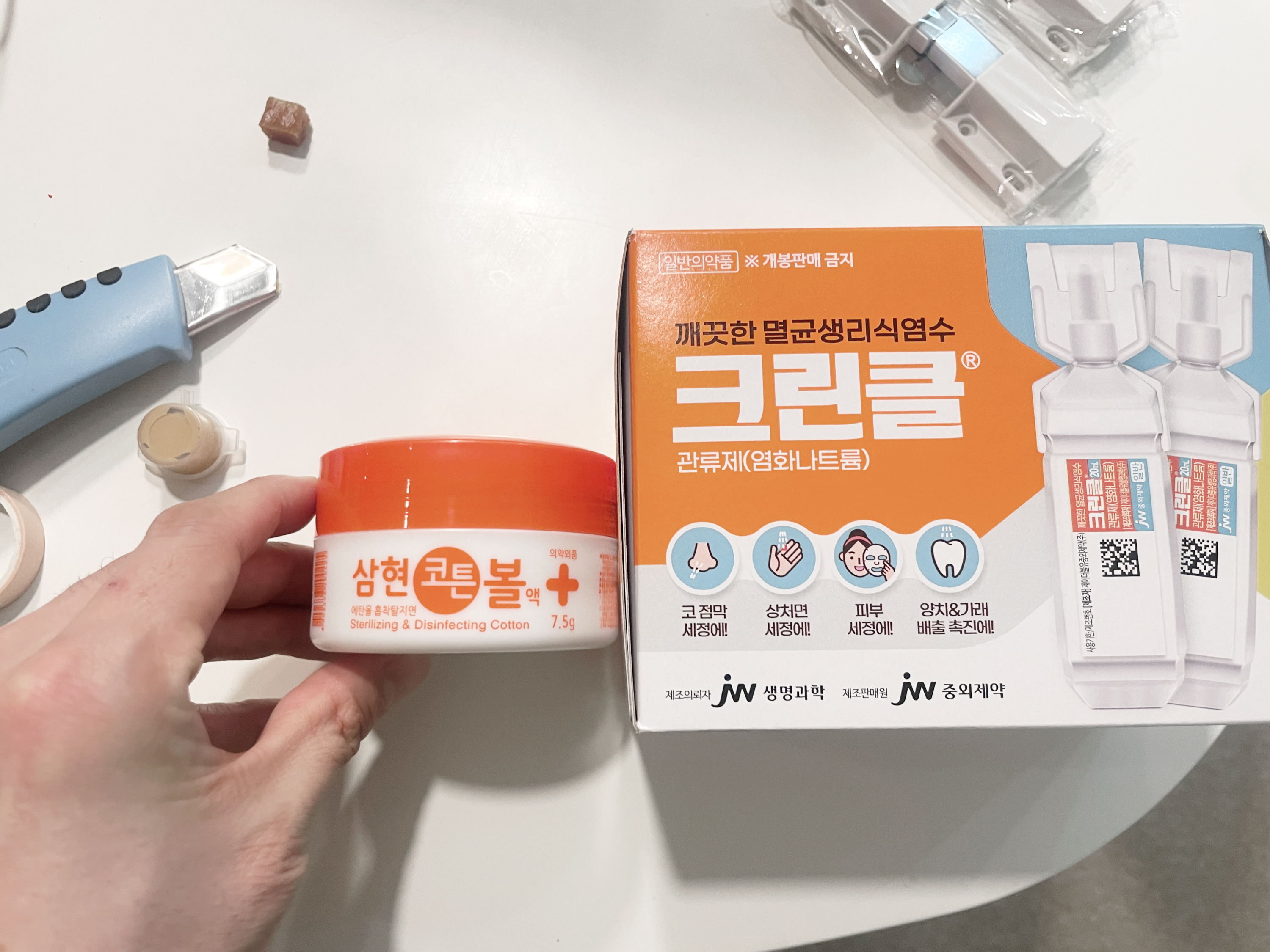 식염수도 큰 통으로 되어있는게 있고 , 개별 포장이 되어있는것도 있는데