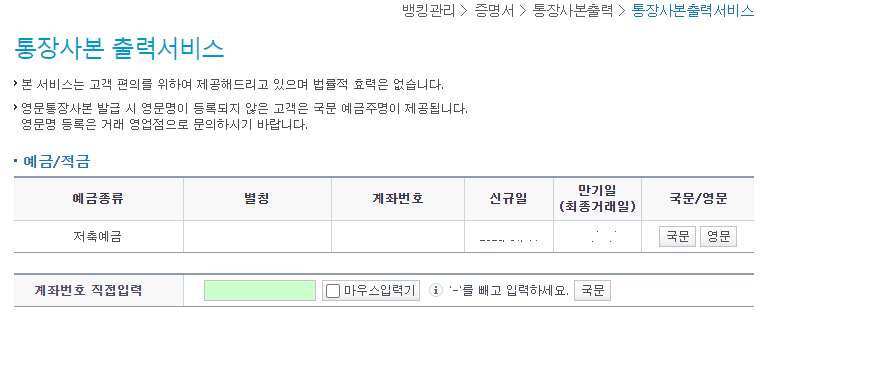 4. 사용하고 있는 계좌가 표시되며 , 출력할 통장 계좌를 선택하고 출력을 국문으로 할지 영문으로 할지 선택합니다.